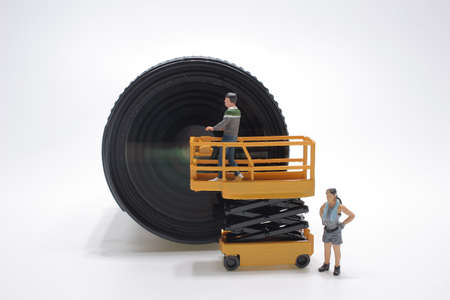 Precision prime optical dslr lens service, adjustment and alignment. Camera lens repair set in photo engineer workplace. Maintenance support of photographic photo camera lens