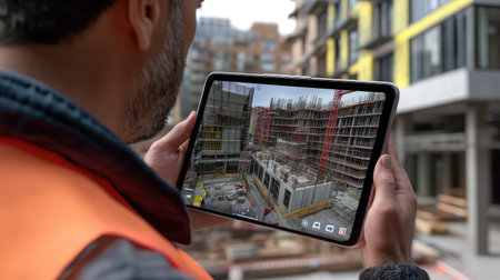 Construction worker holding tablet to capture ongoing building progress. Busy construction site with cranes and scaffolding in background. Concept of construction, engineering, project management.
