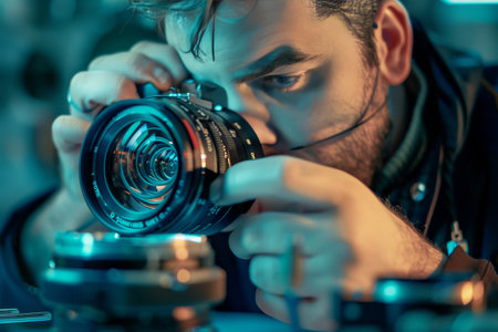 Intense close-up of a focused man examining something with a magnifying glass at night