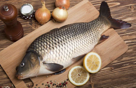 Cooking fish. Fresh small carps on the table on a wooden Board close-up.