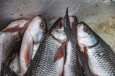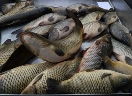 Fresh fish carp. Background of small fish caught in the river crucian carp. Fish farming, farm for the breeding of carp