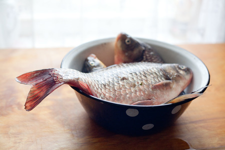 Fresh red Carassius fish ready for cooking. Healthy eating concept, space for text or menu
