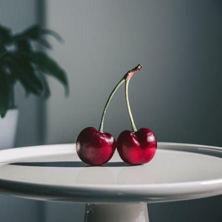 Two ripe red cherries with green stems on a minimalist white table against a soft background.