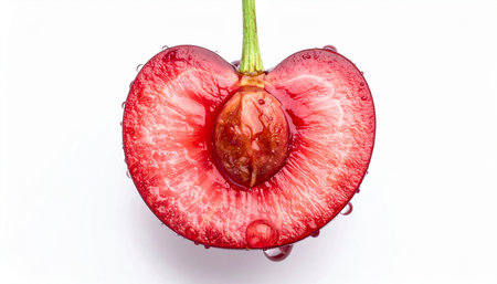 A pile of ripe cherries with tiny water droplets on their shiny skins, isolated on a white background, highlighting their juicy, fresh look.