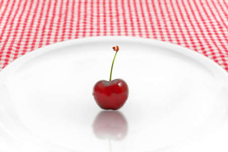 Sweet cherry fruit on the white plate on kitchen table covered with checkered tablecloth.