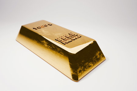 Golden bar. single large gold bullion bar (1000g, 999.9 fine gold) viewed at an angle on a clean white surface. Represents investment, wealth, reserve, security, and banking assets.