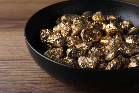 Bowl of gold nuggets on wooden table, closeup