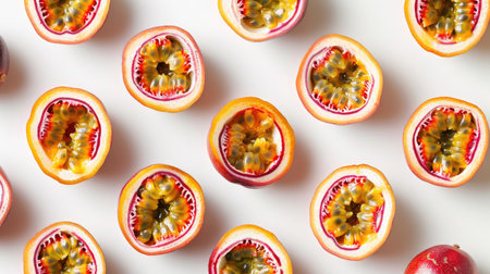 Whole and sliced passion fruits arranged neatly, showcasing their juicy interiors, on a white background