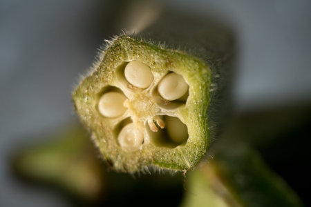 Nature's Microcosm: A Macro Journey into an Okra Pod's World, Embark on a macro journey into the heart of an okra pod with this captivating image. Witness the intricate arrangement