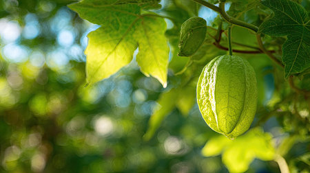 A sunlit portrait of a single Chayote, photographed outdoors on a clear, breezy day. Fresh, crisp air renders vivid detail in the leave veins glowing with gentle backlight. The background falls into a soft natural bokeh of greenery, colors true-to-life, organic beauty in pure sunlight.