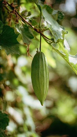 A detailed photograph of a single Luffa, swaying gently in the wind, captured in natural daylight. Fresh and airy atmosphere, soft motion blur on leaves, crisp details on textures, background softly blurred into natural greenery, cinematic natural light, realistic photography.