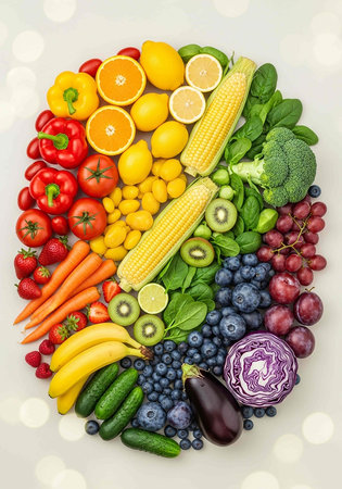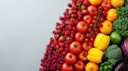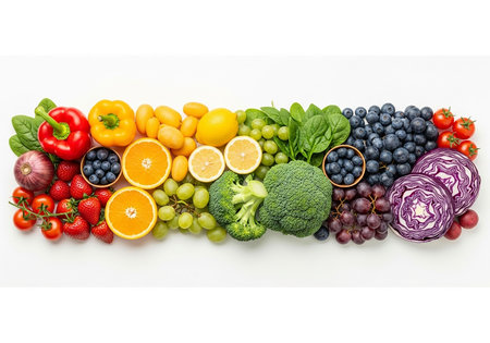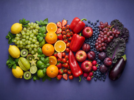 Colorful array of fresh fruits and vegetables organized in rainbow gradient from purple to red. Perfect for health, nutrition, diet, wellness marketing materials and food industry campaigns.