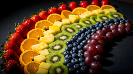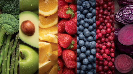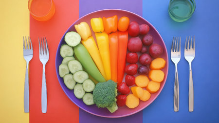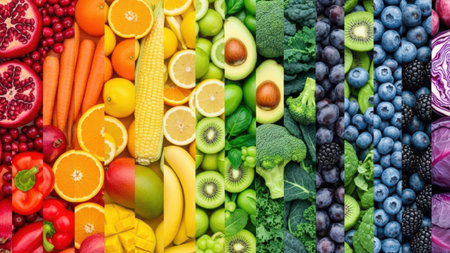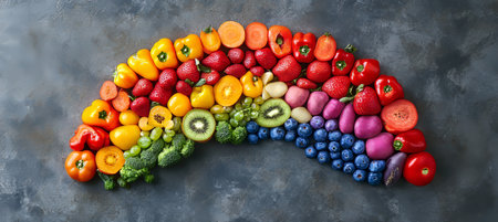 rainbow gradient made of various fruits and vegetables, created with generative ai