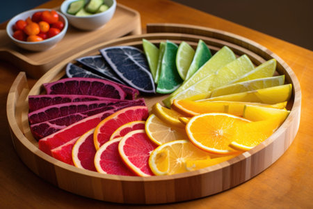 colorful fruit slices on a wooden tray, created with generative ai