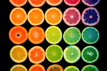 Slices of lemon, lime, orange and grapefruit on a black background. AI Generated