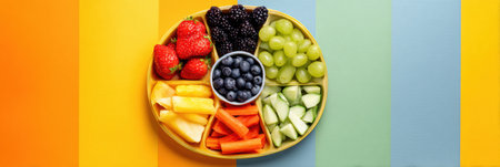 A vibrant and artistic arrangement of fresh fruits and vegetables displayed on a round plate, showcasing natural colors and promoting healthy eating habits and fresh food aesthetics.