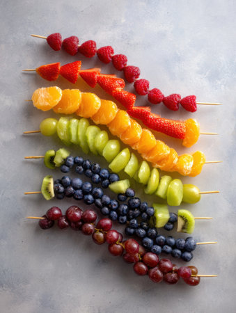 A vibrant arrangement of fruit skewers showcases an array of fresh fruits on pastel-colored plates, perfect for summer gatherings or healthy snacking.