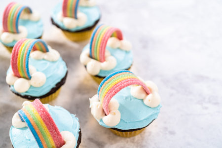 Chocolate cupcakes decorated with blue buttercream frosting and rainbow for unicorn theme birthday party.