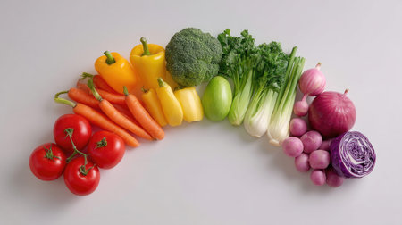 A vibrant arrangement of fresh vegetables showcased in a rainbow pattern. Ideal for promoting healthy eating, culinary creativity, and vibrant dishes in your kitchen.