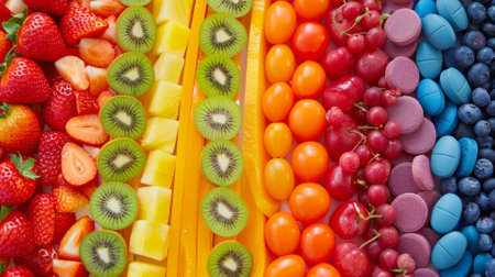 Capsule rainbows ending in fruit pots, spectrum of health