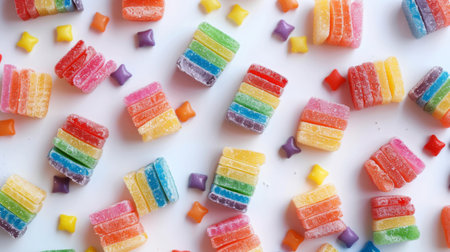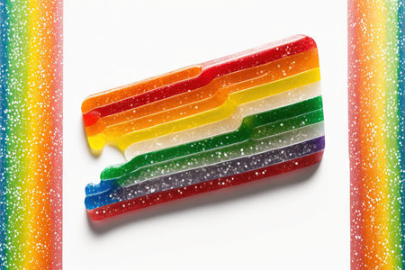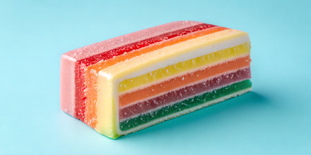 Vibrant rainbow layered gummy candy bar on a soft blue background