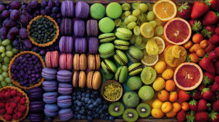 This vibrant arrangement features a variety of fresh fruits alongside elegantly displayed macarons on a rustic wooden table. Perfect for food photography, culinary inspiration, or event decoration.