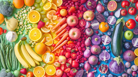 Colorful variety of fruits vegetables arranged in rainbow spectrum food flat lay. Fresh produce arrangement for vibrant healthy nutrition balance diet.