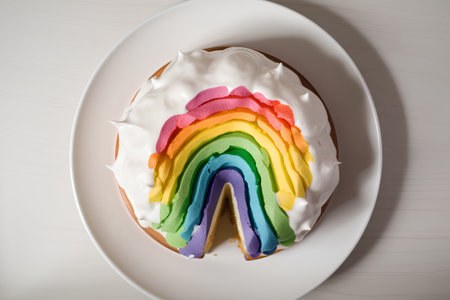 Colorful rainbow sponge cake on white plate
