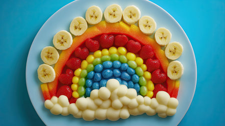 A colorful fresh fruit rainbow with banana clouds, arranged playfully on a plate to make healthy eating fun.