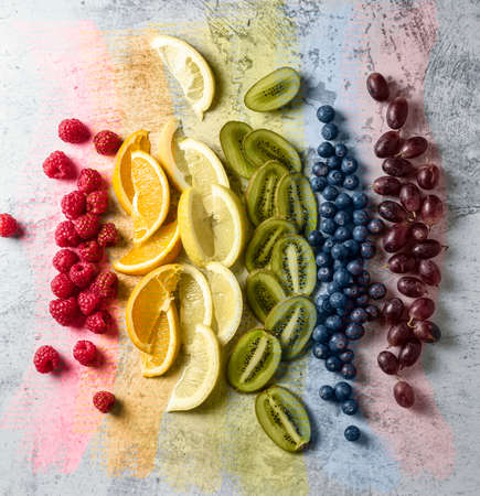 Rainbow color mix stripes with fruit and slices. Healthy eating, colorful, organic bio food concept. Abstract background, flat lay.