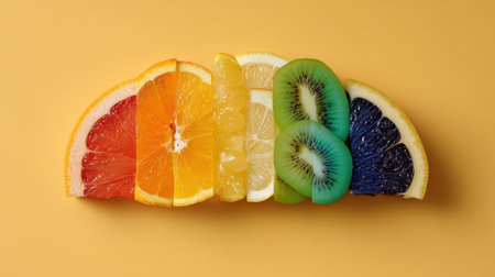 A stunning display of vibrant sliced fruits arranged beautifully on a bright yellow background, perfect for promoting healthy eating, freshness, and nutrition.