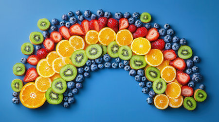 A vibrant rainbow made of assorted fruits, including blueberries, watermelon, and melon, arranged artistically on a gray background. Perfect for creative food displays.