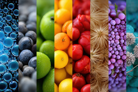 A display of fruits and natural textures showcases a vibrant array of colors, highlighting nature's diversity.