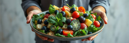 A top view of female hands taking a strawberry from a plate with a healthy salad