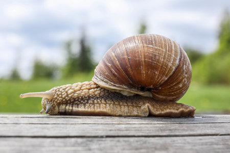 A big snail is crawling on the wet wooden road after the rain. copyspace. natural background. Calmness concept. low speed. Invertebrate animal. rainy weather. One mollusk. Vine gastropod. side view.