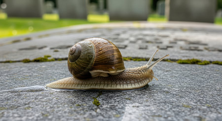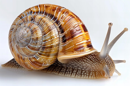 A detailed image of a snail with a patterned shell crawls in a natural setting. The shell exhibits spiral patterns, and the body has a textured surface. The scene is bathed in soft, natural light, and the composition focuses on the subject. Suitable for editorial and commercial use, the image is well-suited for diverse applications.