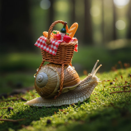 A whimsical image of a snail carrying a picnic basket filled with various food items. The basket contains a bottle of wine, a baguette, tomatoes, and carrots, all neatly arranged on a checkered cloth. The snail appears to be leisurely moving forward, creating a charming and playful scene.