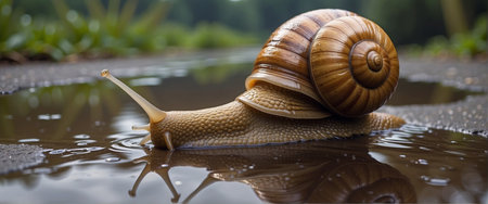 A curious snail makes its way across the wet asphalt, reflecting the beauty of nature on a rainy day, surrounded by glistening droplets.
