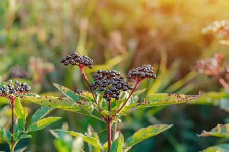 Elderberry. View of a bunch of black wild elderberries over green leaves. Autumn forest, soft focus, medicinal plant
