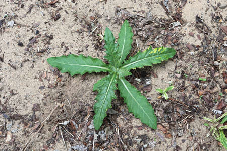 Close-up of hairy rosette with dew drops and fallen leaves of Verbascum thapsus large or common mullein in its first year of growth.