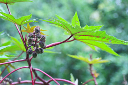 Urtica pilulifera or Roman nettle green plant flowering with small balls in spring season, botany background