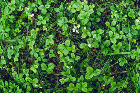 Dark green leaves of Strawberry in dew, natural background of nature. Texture of the leaves. Leaves green background.