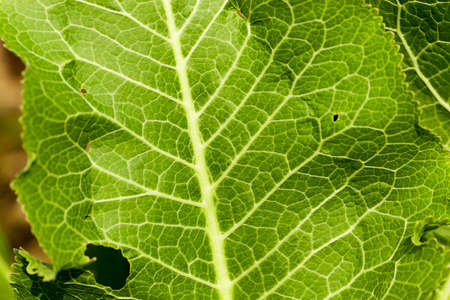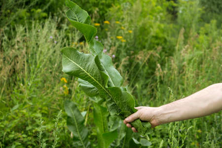 Green leaves of the plant horseradish in the hands of a man on the background of green nature.