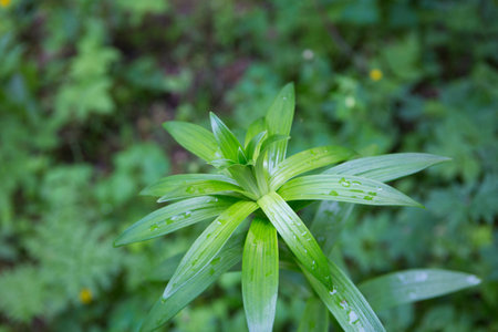 unbloomed sprouting lily (lilium) flower rosettes foliage with rain drops on green leaves filled frame background wallpaper close up macro shot