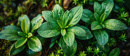A macro shot capturing the intricate detail of water droplets adorning the vibrant leaves of a plant in a lush environment.