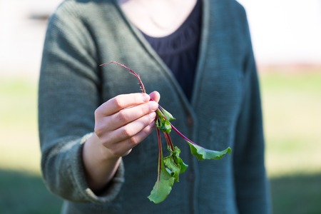 Woman hands with just picked young beetroot. Natural ecologic garden vegetables.