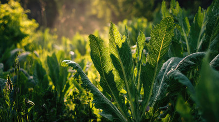 The Cardoon in spring, fresh green leaves, soft sunlight filtering, vibrant atmosphere full of vitality, natural textures, serene mood.