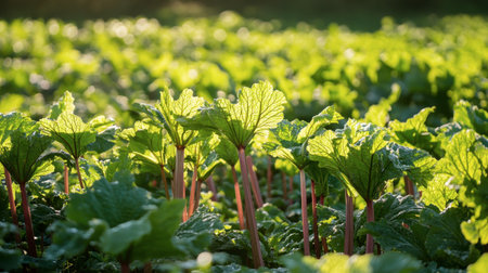 A lively arrangement of fresh rhubarb plants thriving in a sunlit green field. The vibrant leaves and stems showcase the beauty of nature's bounty.