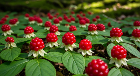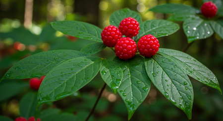 A leafy green plant with a cluster of black berries on it. The berries are small and clustered together, giving the plant a dense and lush appearance. Concept of abundance and growth
