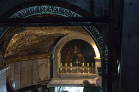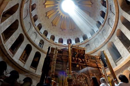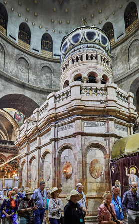Jerusalem, Israel - May 25, 2017: Jesus Christ Empty tomb and Dome rotunda over it in Jerusalem in the Holy Sepulcher Church. The Sepulchre Church and Empty Tomb are the most sacred places for all Christians on the planet.